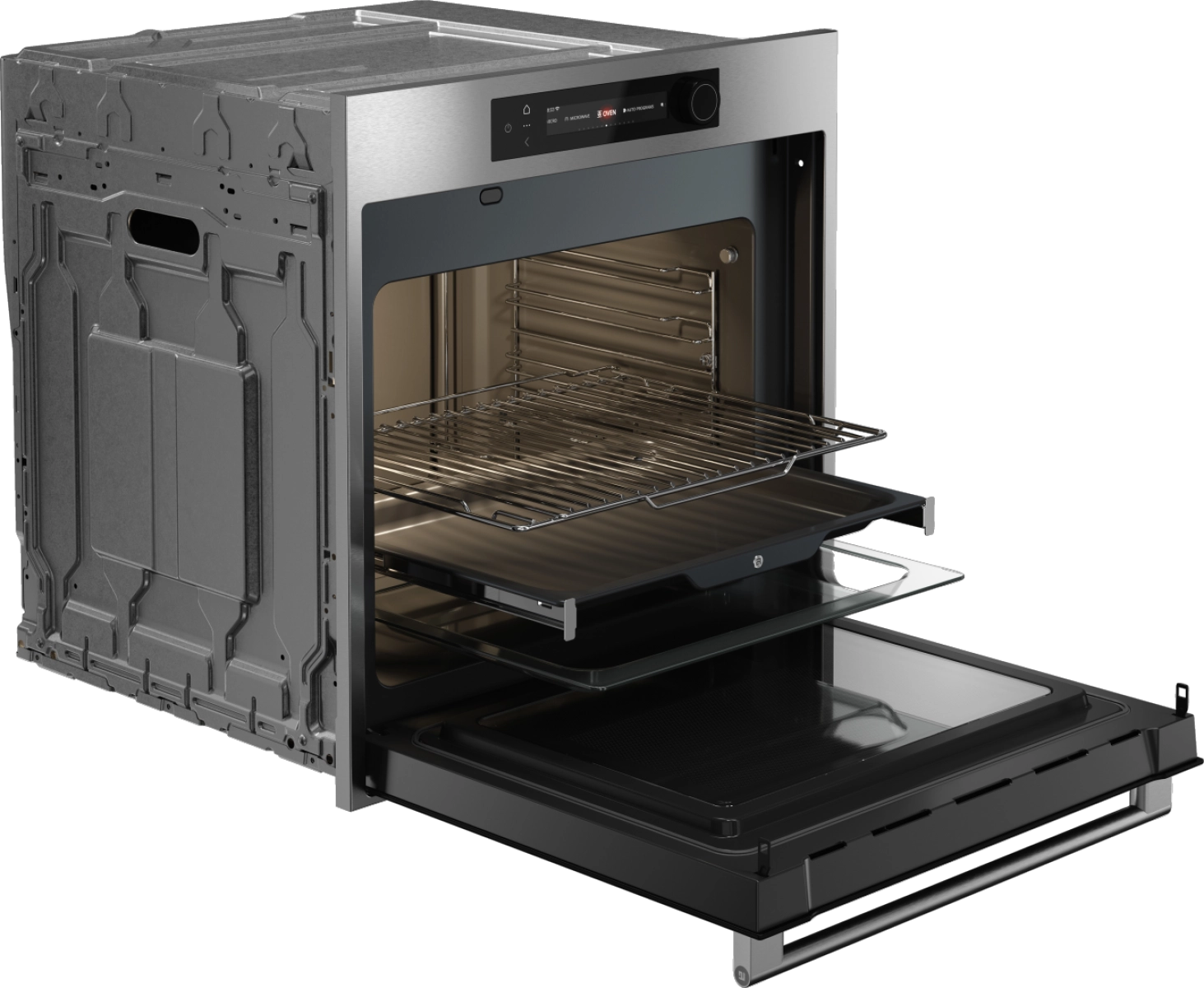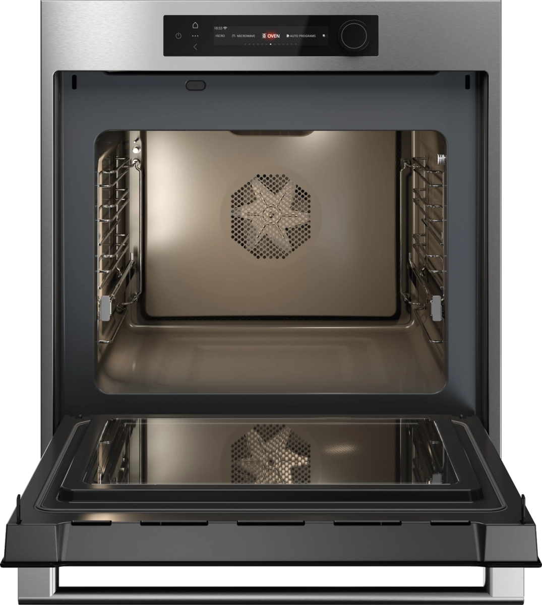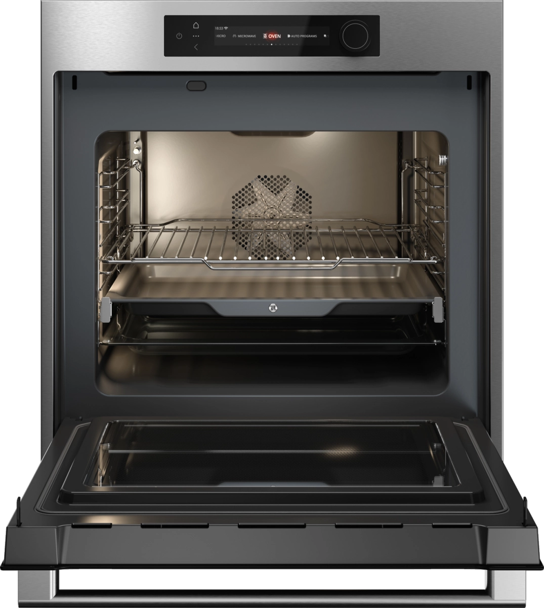 Управление собранное и понятное. 6‑дюймовый TFT‑дисплей с сенсорными зонами и поворотным регулятором мгновенно реагирует, позволяет сохранять персональные настройки и рецепты. LED‑подсветка равномерно освещает камеру, а регулировка яркости и цветовой температуры помогает комфортно контролировать процесс. Корзина удобств дополняется плавным закрыванием, частично выдвижными телескопическими направляющими на одном уровне и тройным остеклением двери — фронт дольше остается прохладным, а доступ к противням безопасен.