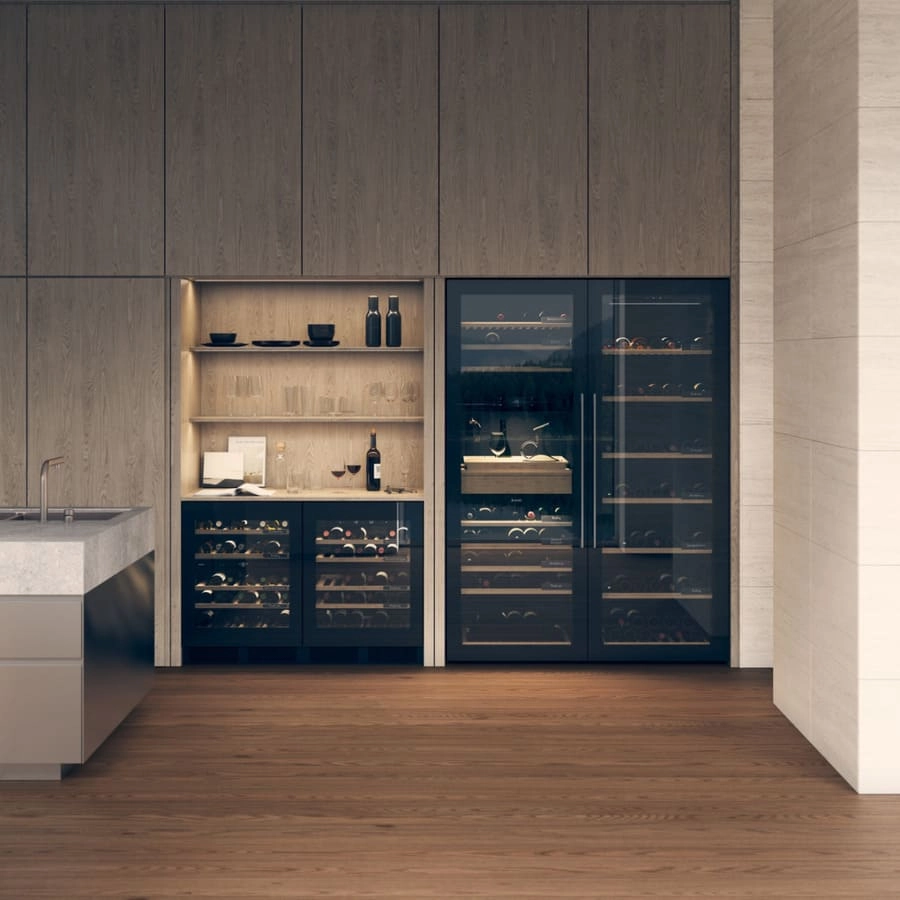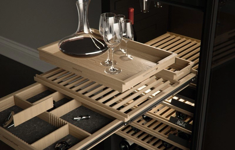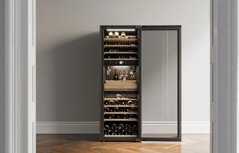 Модель предназначена для хранения до 190 бутылок вина (0,75 л) на деревянных стойках с мягкими телескопическими направляющими. Высококачественное стекло двери с УФ-фильтром защищает напитки от вредных ультрафиолетовых лучей. Для оптического считывания этикеток винных бутылок используется сенсорный дисплей. Он собирает и хранит данные, а также предназначен для дальнейшего ведения инвентаря винного климатического шкафа.