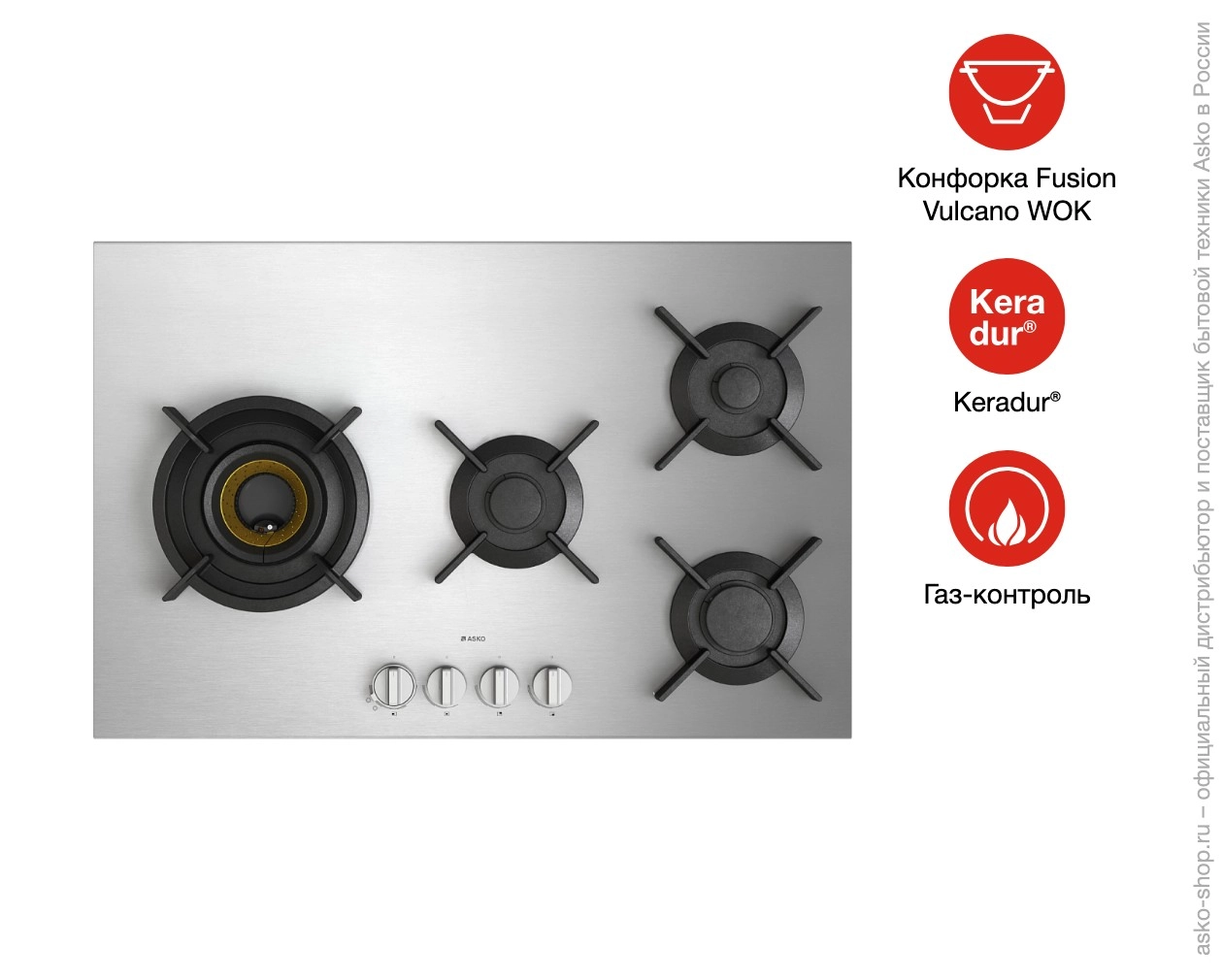 - Варочная поверхность Аско HG1885SB оснащена редкой горелкой Wok Fusion Volcano с латунными вставками. Она имеет в центре три ряда пламени, расположенных друг под другом. Благодаря этому и специальному держателю вы сможете готовить на традиционном воке.