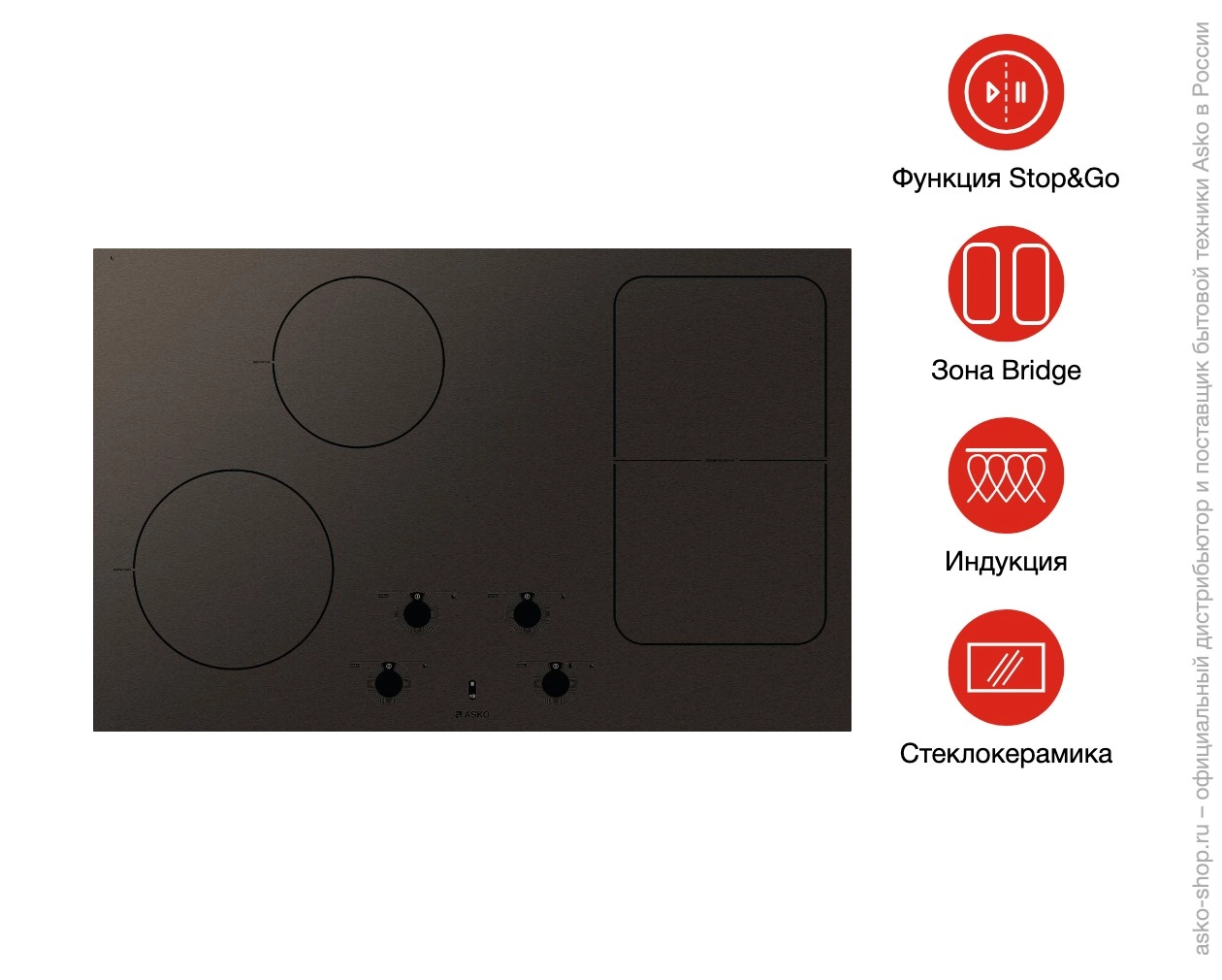 Варочная панель Asko HI1884MF выпускается шириной 80 см. Обычно для четырёх конфорок выбирают более стандартные параметры — 60 см. Это означает, что расстояние между зонами нагрева увеличено, благодаря чему ставить кухонную утварь на них стало проще. Даже пятилитровая кастрюля не помешает другой посуде. Функция Bridge объединяет две правые конфорки в одну большую с гибкой Flex-геометрией. Это увеличивает площадь нагрева, благодаря чему появляется возможность использовать противни и утятницы. Панель управления IrisControl позволяет выставить необходимые параметры одним лишь нажатием пальца.