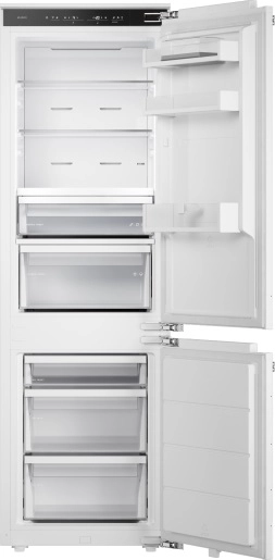 Общий полезный объем холодильника составляет 256 литров (180 л холодильная камера, 76 л морозильная). Внутри холодильного отсека предусмотрены три прочные стеклянные полки на дверце и специально разработанные зоны свежести: нулевая камера для оптимального хранения мяса и рыбы, и отдельный отсек с автоматическим контролем влажности для бережного хранения фруктов и овощей. Все ящики холодильной камеры установлены на полностью выдвигающиеся телескопические направляющие, обеспечивая легкий доступ. Яркое боковое LED-освещение равномерно освещает каждый уголок.