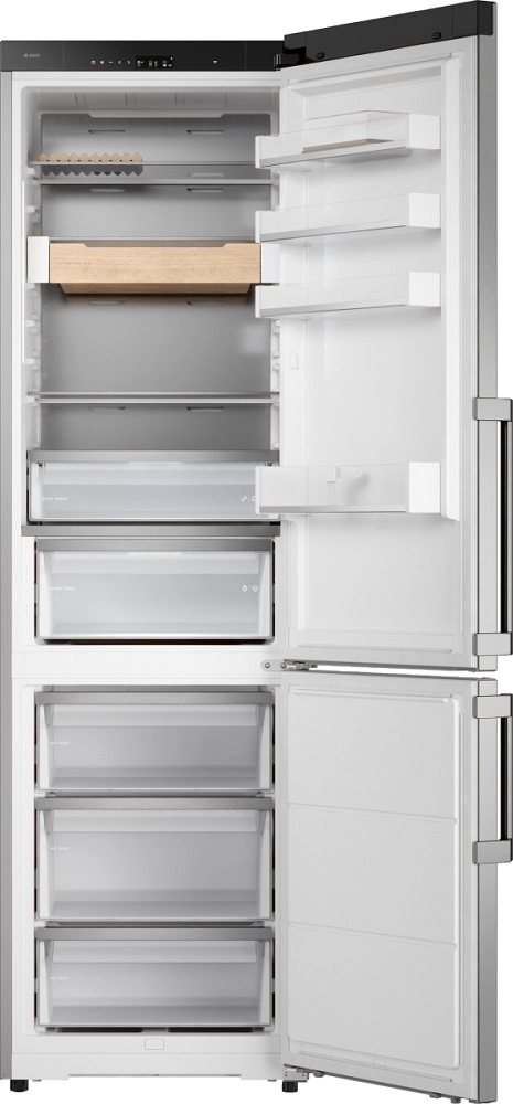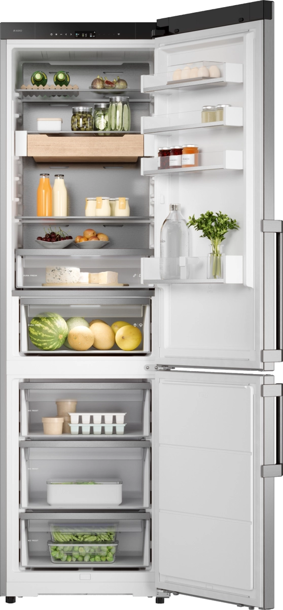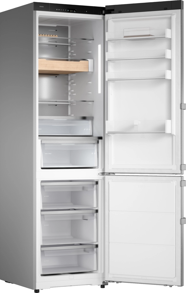 ASKO RFC526RNBS1 — современный отдельно стоящий холодильник высотой 203 см, выполненный в прочном и стильном корпусе из нержавеющей стали. Общий полезный объём 409 л (279 л холодильной камеры и 130 л морозильной) позволяет удобно хранить большие запасы продуктов и напитков, при этом внутреннее пространство организовано для максимального комфорта: три морозильных ящика на телескопических направляющих, множество полок из стекла и четыре дверные полки обеспечивают порядок и быстрый доступ.