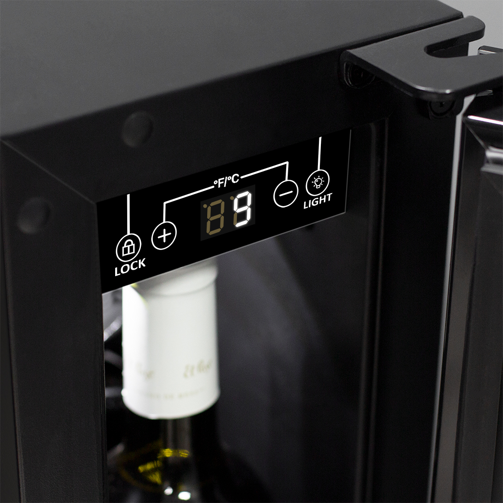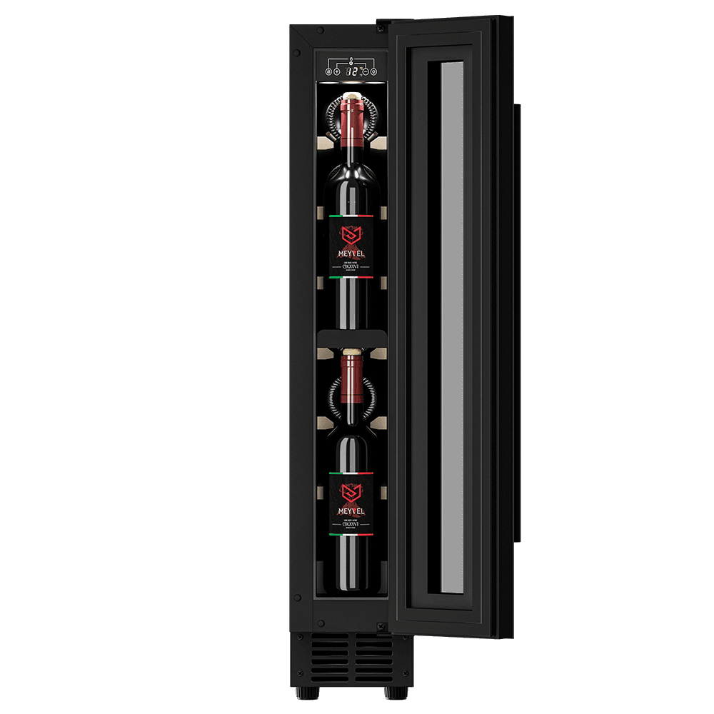 Компрессорный винный шкаф Meyvel MV9-KBT1 несмотря на небольшой размер, обладает большой вместимостью и дает возможность разместить до 9 бутылок. Располагаются они на держателях из массива бука. Внутреннее пространство шкафа поддерживает комфортную для вина температуру от +5℃ до +20℃ и имеет самую большую вместимость среди аналогичных винных шкафов. Преимуществом этой модели является возможность разместить внутри одну высокую бутылку. Так же, MV9-KBT1 данная модель поддерживает влажность в диапазоне 60-80%, как в настоящем винном погребе.