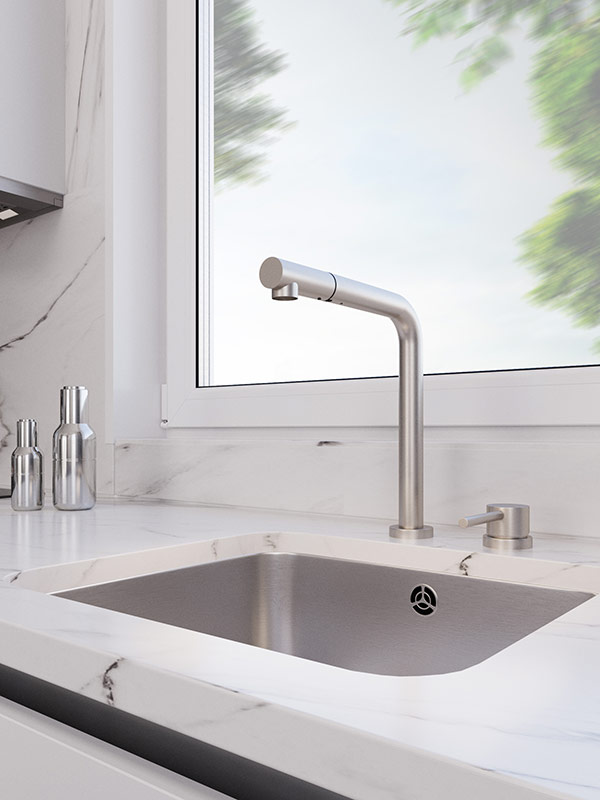 Выдвижной излив увеличивает площадь и эффективность использования смесителя. Однорычажное управление поможет легко регулировать температуру и напор подачи воды. Соответствует стандартам DIN DVGW.