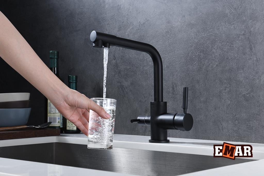 Кухонный смеситель с возможностью подключения фильтра для очистки воды. Фильтрованная вода подается отдельной ручкой через отдельную трубку и не смешивается с водопроводной водой. Однорычажное управление поможет легко регулировать температуру и напор подачи воды. Соответствует стандартам DIN DVGW.