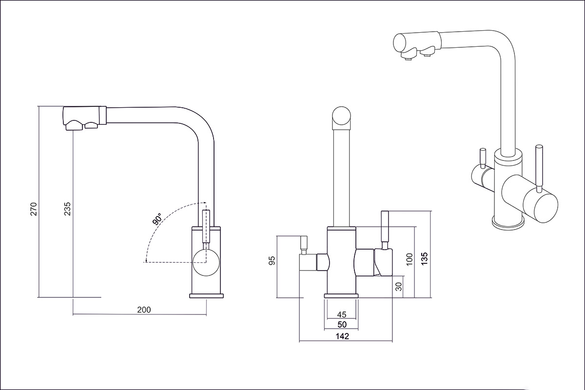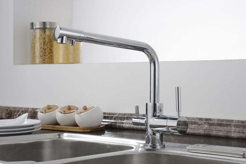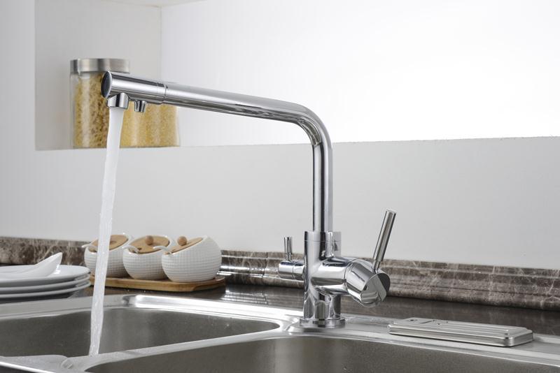 Кухонный смеситель с возможностью подключения фильтра для очистки воды. Фильтрованная вода подается отдельной ручкой через отдельную трубку и не смешивается с водопроводной водой. Однорычажное управление поможет легко регулировать температуру и напор подачи воды. Соответствует стандартам DIN DVGW.