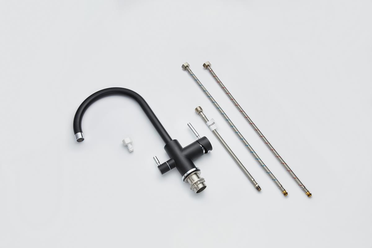Кухонный смеситель с возможностью подключения фильтра для очистки воды. Фильтрованная вода подается отдельной ручкой через отдельную трубку и не смешивается с водопроводной водой. Однорычажное управление поможет легко регулировать температуру и напор подачи воды. Соответствует стандартам DIN DVGW.