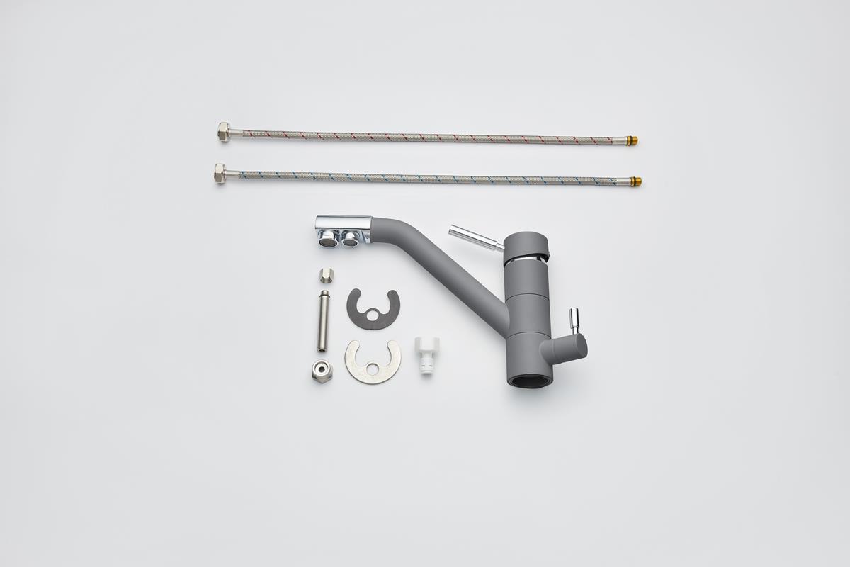 Кухонный смеситель с возможностью подключения фильтра для очистки воды. Фильтрованная вода подается отдельной ручкой через отдельную трубку и не смешивается с водопроводной водой. Однорычажное управление поможет легко регулировать температуру и напор подачи воды. Соответствует стандартам DIN DVGW.