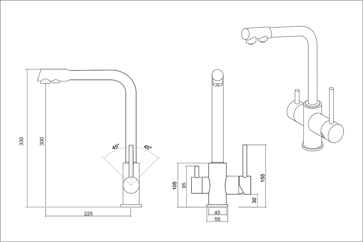 • Высота смесителя: 330 мм • С подключением фильтра для воды • Изоляторы против нагрева ручек • Керамический картридж • Поворотный излив • Материал – нержавеющая сталь • Установочное отверстие под смеситель Ø 35 мм • Гарантия на смеситель 5 лет