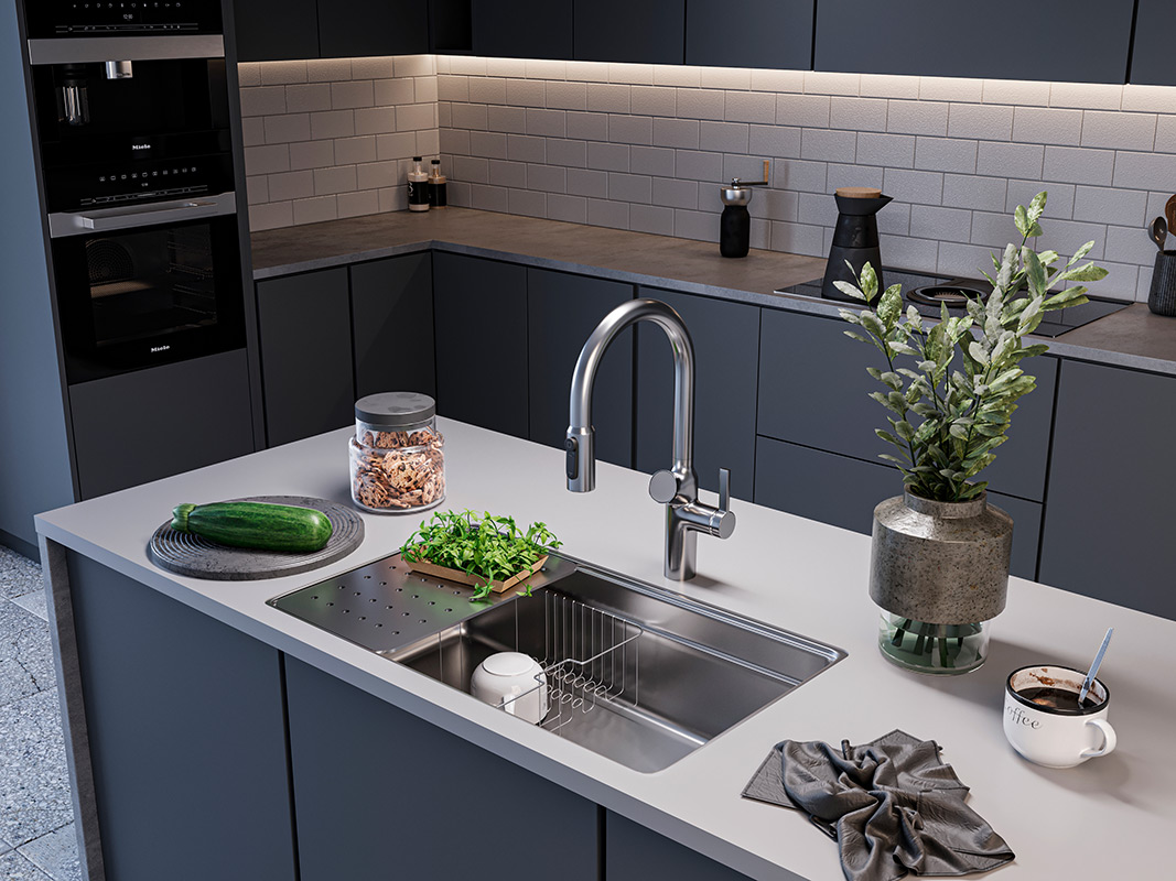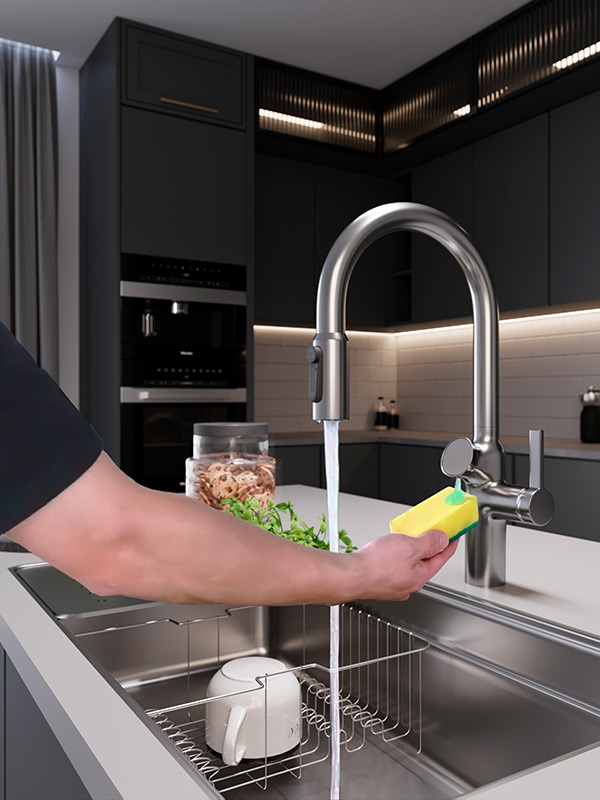 Смеситель с возможностью подключения фильтра для очистки воды, выдвижным душем и сенсорным дозатором для подачи моющего средства.