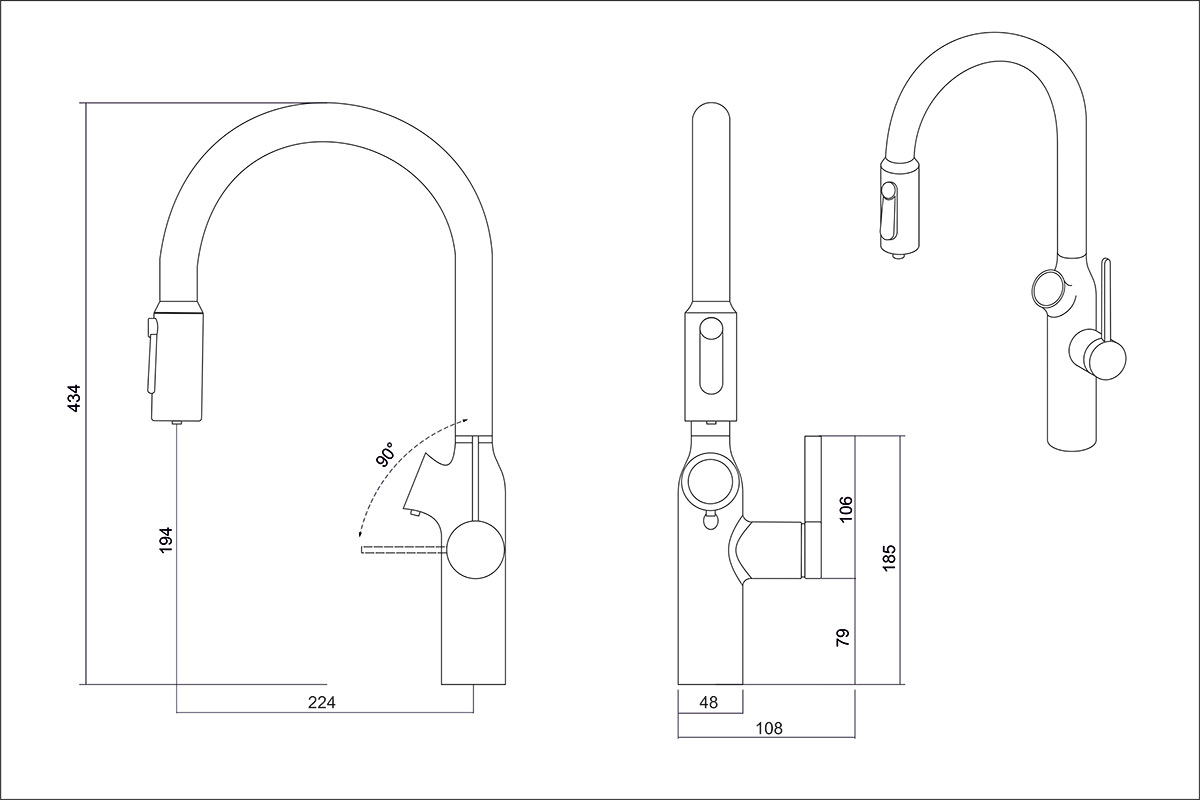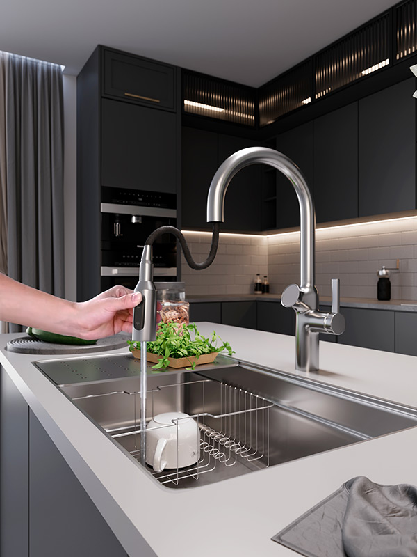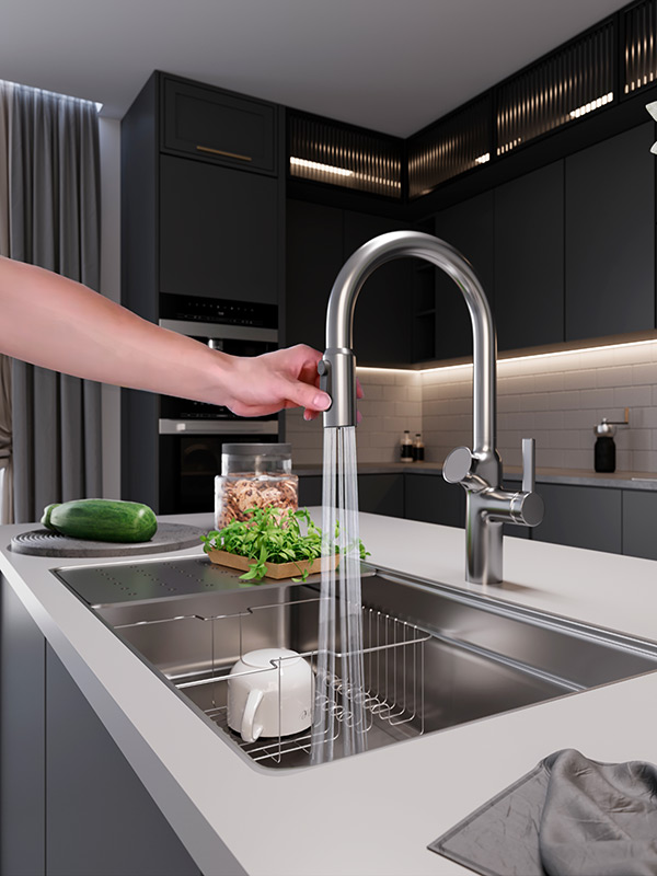 Однорычажное управление поможет легко регулировать температуру и напор подачи воды. Выдвижной излив увеличивает площадь и эффективность использования смесителя. Дополнительной кнопкой, расположенной на выдвижном изливе, возможно переключение режимов подачи воды – струя / душ.
