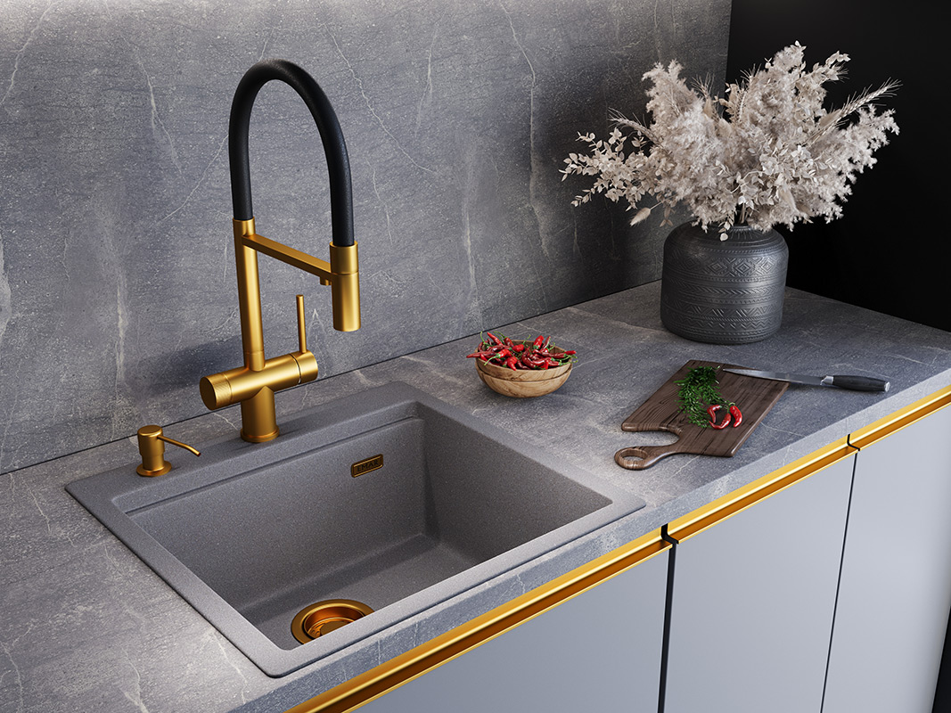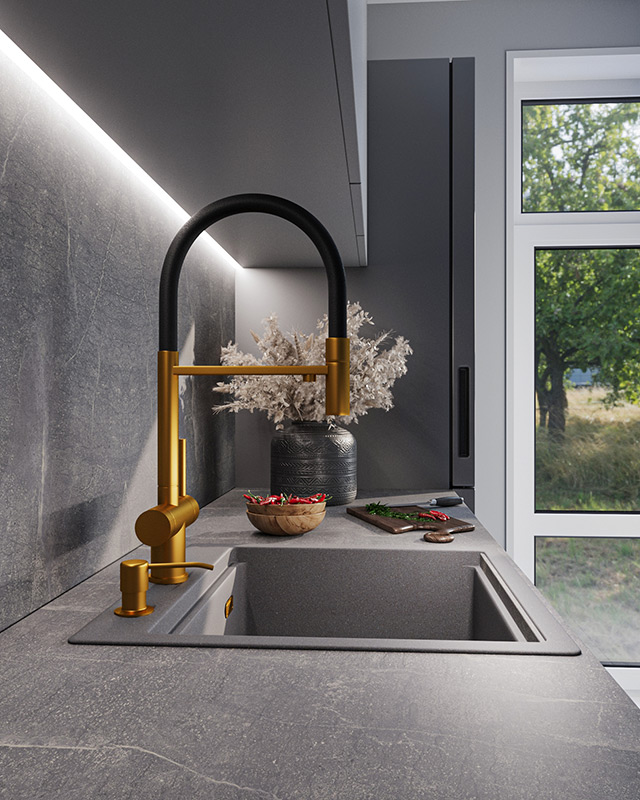 Удобный гибкий гусак, из приятной софт-тач резины. Подача фильтрованной воды скрыта в крепление гусака. |