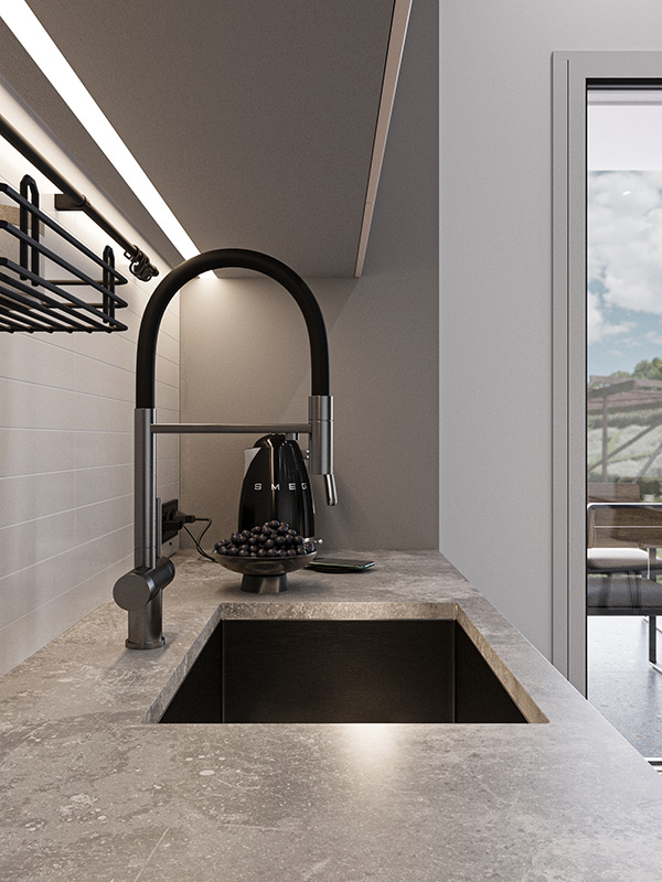 Удобный гибкий гусак, из приятной софт-тач резины. Подача фильтрованной воды скрыта в крепление гусака. |
