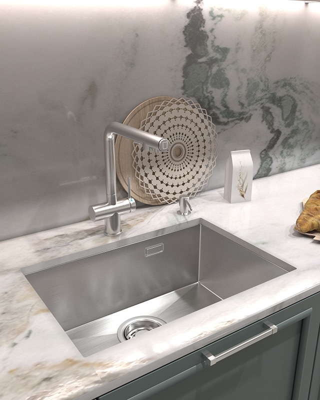 Кухонный смеситель с возможностью подключения фильтра для очистки воды. Фильтрованная вода подается кнопкой расположенной на выдвижном изливе через отдельную трубку и не смешивается с водопроводной водой.