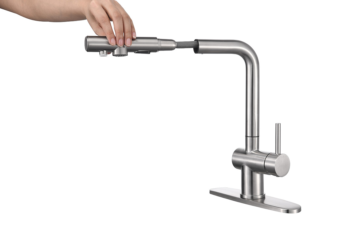 Смеситель 3 в 1 - Подача проточной воды, питьевой и выдвижная лейка с переключением на душ. Кнопка подачи воды с фиксатором, расположена на выдвижной лейке. |