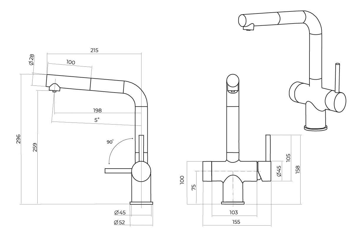 • Высота смесителя: 296мм• С подключением фильтра для воды• С выдвижным изливом• Изоляторы против нагрева ручек• Керамический картридж• Поворотный излив• Материал - латунь• Установочное отверстие под смеситель Ø 35 мм • Гарантия на смеситель 5 лет (гарантия на покрытие – 1 год)