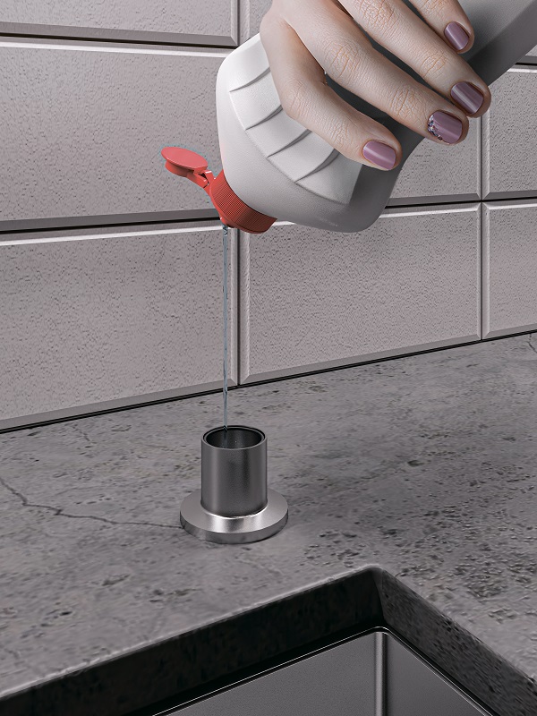Дозатор - лучшее дополнение к кухонной мойке. Удобный залив через верхнюю горловину существенно облегчает обновление моющей жидкости |