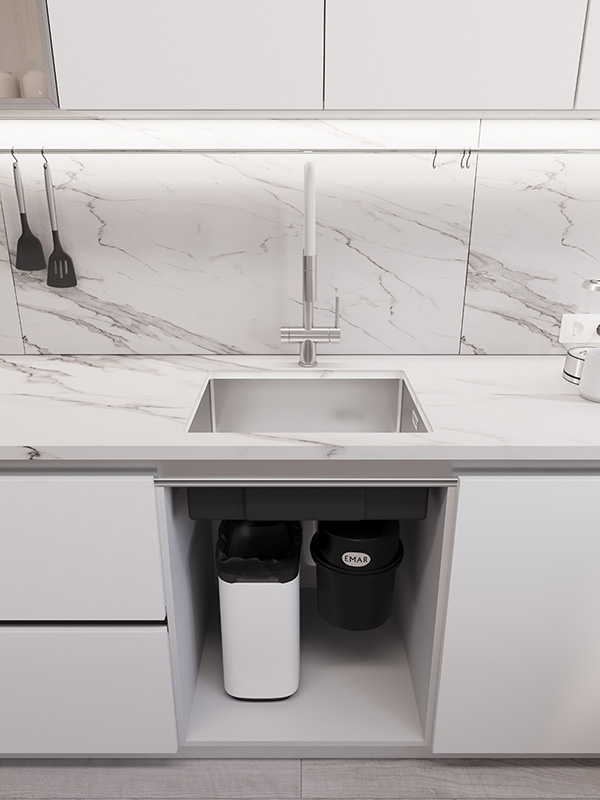 Мойка имеет смещённое отверстие под чашу слива, что позволяет эффективней использовать простравнство под ней. Сифон или измельчитель прижаты к одной стороне и оставляют больше места под фильтры и сортировку мусора. За счёт центарльного расположение слива и перелива - мойка становится оборачиваемой и можно расположить слив в удобной стороне |