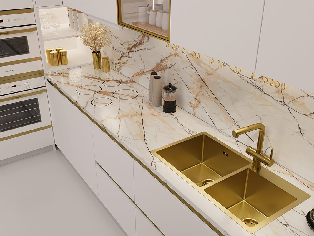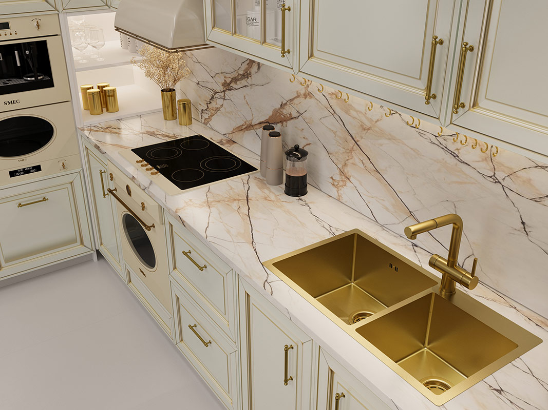 Мойка с PVD покрытием привелкает к себе внимание цветом. И обладает более стойким покрытием к царапинам |